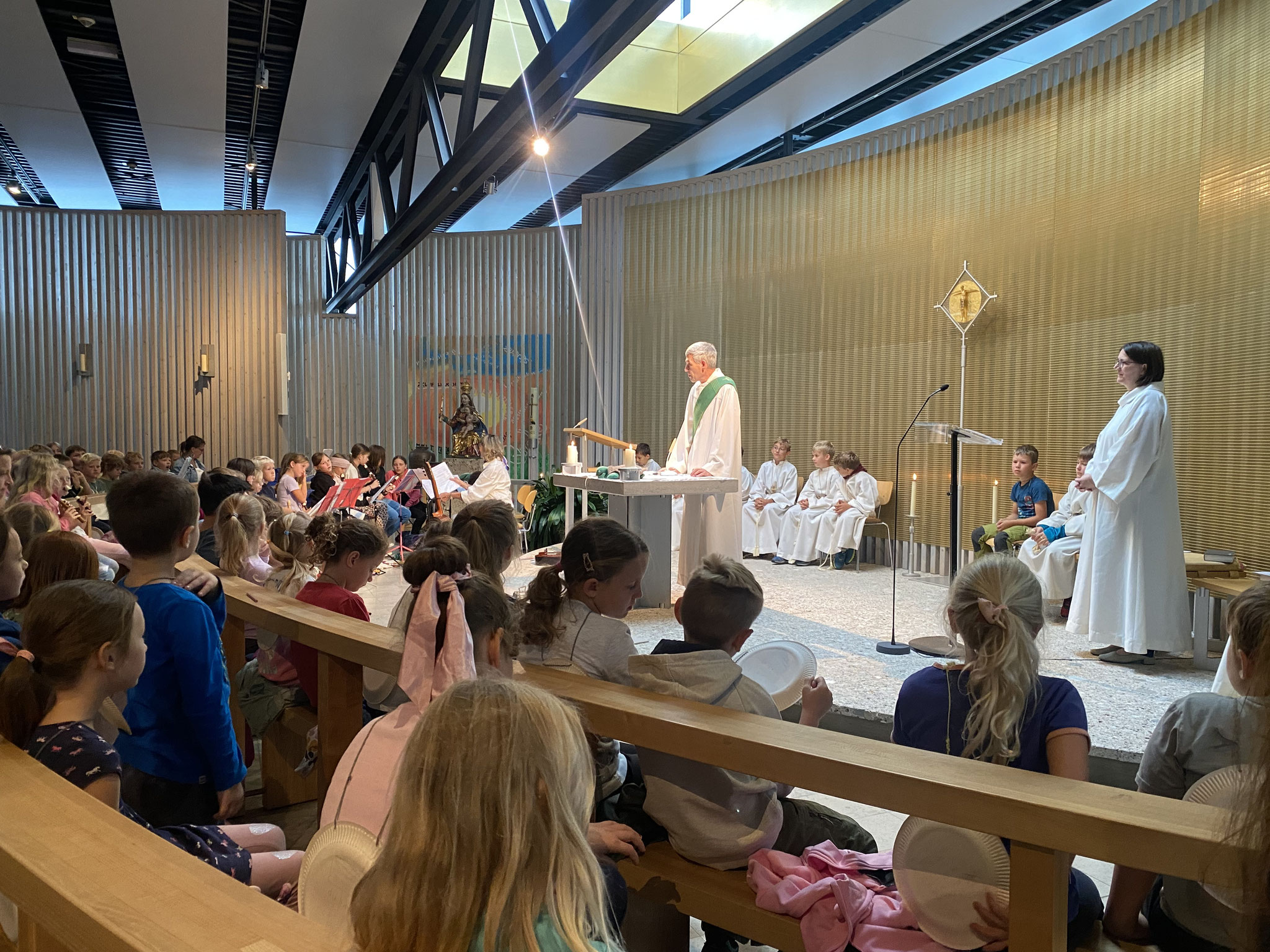 Mit einem fröhlichen Gottesdienst verabschiedeten sich die Schülerinnen und Schüler der Grundschule Soyen in die Sommerferien. Gestaltet wurde der Gottesdienst von Religionslehrerin Frau Bräu und Diakon Herrn Bichler. Im Mittelpunkt stand Resi, die Schildkröte, die die Kinder das ganze Schuljahr über begleitet und ihnen dabei geholfen hat, ihre Resilienz zu stärken.